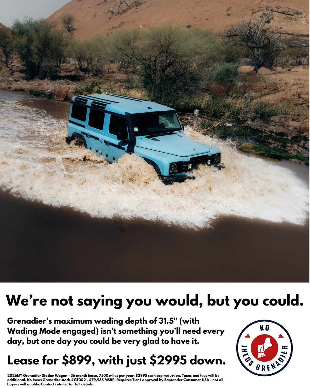 Lease a new 26MY Grenadier Station Wagon - nicely equipped - for $899 per month for 36 months with 7500 miles per year. Applies to stock number GT002, $79,985 MSRP. $2,995 cash cap reduction, first month payment, $545 documentation fee, $895 acquisition fee, and any applicable taxes and registration fees will be due at sign. Subject to Tier 1 approval by Santander Consumer USA. Not all lessees will qualify. Offer valid through 3/31/2026.