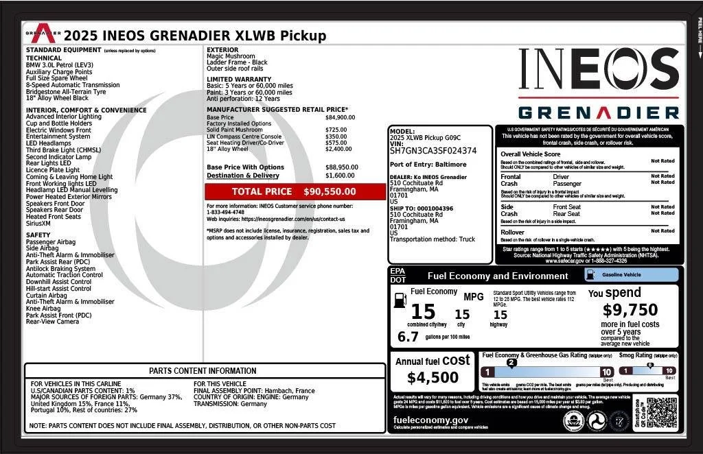 All new Grenadiers are covered by a FIVE-YEAR/60,000 mile new car warranty, as well as a 12-year UNLIMITED MILEAGE corrosion warranty.